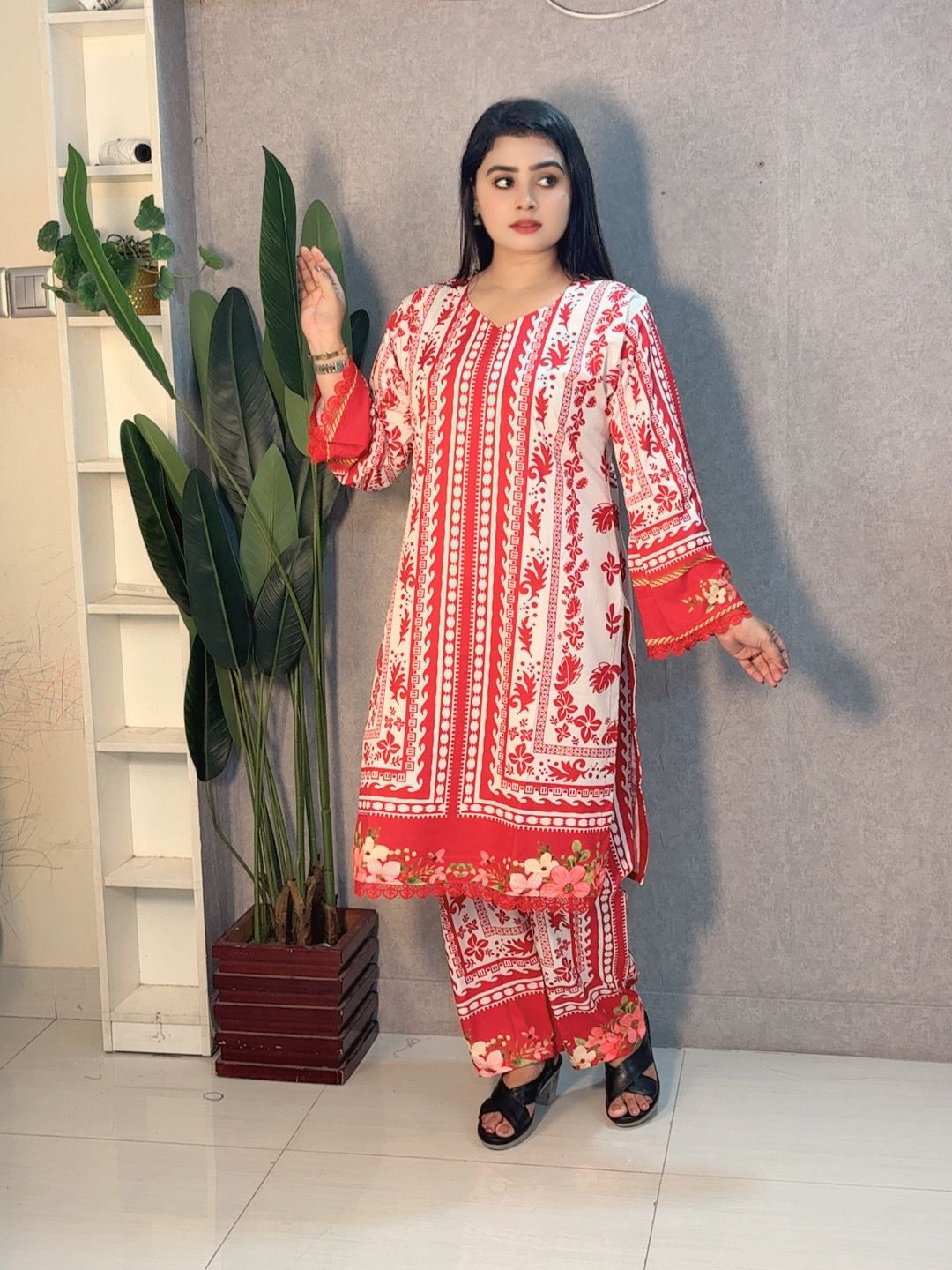 Floral Grace – Red & Ivory Printed Two Pieces
