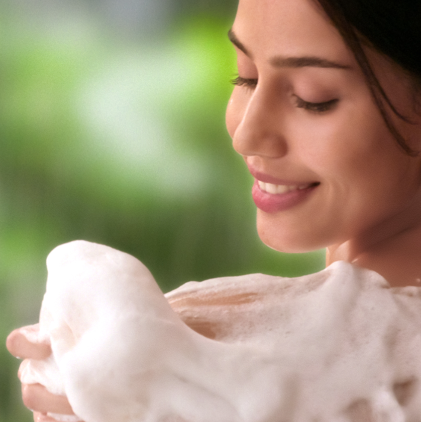 The free loofah enhances your bathing ritual by creating a rich foam and providing gentle